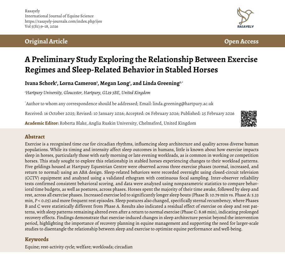 This month’s Pick of the Month explores a fascinating and often overlooked aspect of equine management — the relationship between exercise and sleep in stabled horses. This preliminary study offers valuable insights into how changes in workload can significantly influence sleep patterns, duration, and recovery in horses, with effects that persist beyond the exercise period.